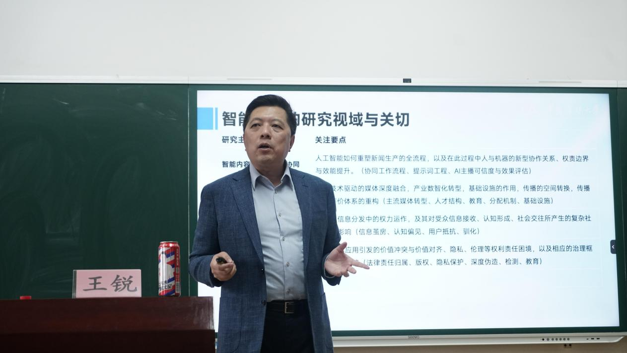 2025年11月6日下午,中国传媒大学信息传播学院王锐教授应邀来访我院,并作题为“智能时代新闻传播研究的视域转向与方法创新”的学术讲座。王锐教授毕业于美国路易斯安那州立大学大众传播学院,曾执教于美国波士顿大学传播学院,并拥有丰富的新闻一线工作经验,先后在中央人民广播电台的“中国之声”“经济之声”任职,研究领域涉及新兴媒体与国际传播等。讲座由学院党委书记张丽萍教授主持,吸引了学院部分教师及新闻系本科生、...