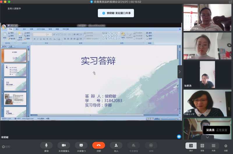 郭怡同学的实践单位是央视网《我的军旅梦》节目组,实习中她深入到训练一线,与军人们共同经历风雨,把“铁汉”背后的热血故事传达给观众。蒙汉兼通的王伟伟同学在答辩中说:“我采访能力不足,每一次采访遇到的问题我都记录下来并不断总结,尽量避免错误再犯。”闫石同学更是通过色彩饱满的图片和激情的讲述将“湖南卫视”自由、独立的工作气氛传达给大家。老师们对同学们的实习工作做出了积极肯定,并告诫同学们做任何事都要保持认真的态度,对自己负责也是对新闻负责。虽然隔着电脑屏幕,但答辩各组的火热气氛丝毫不减。