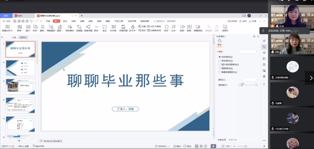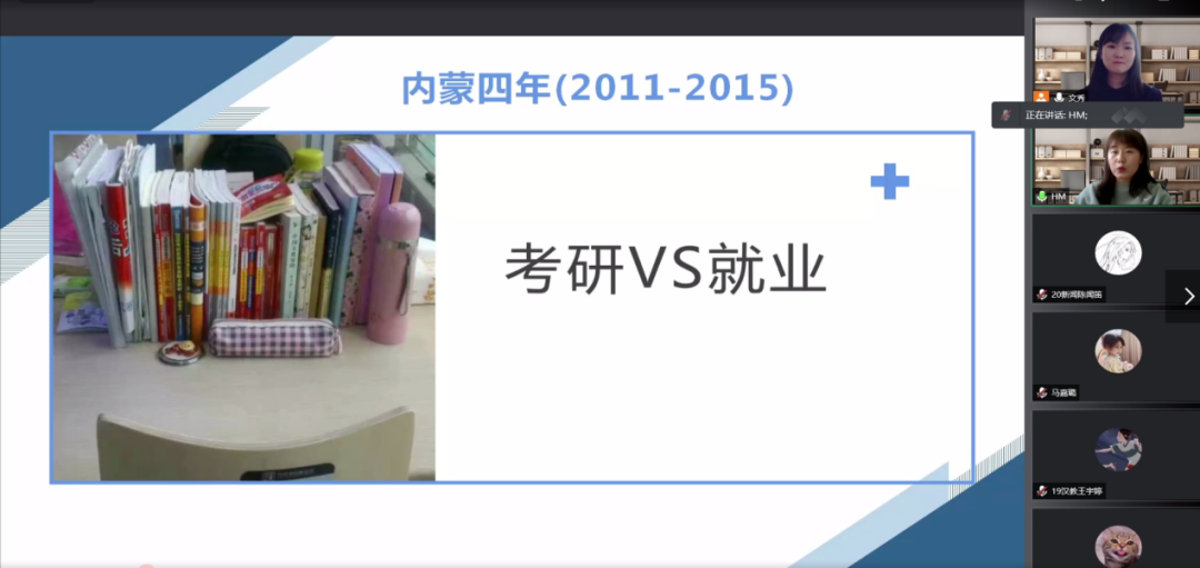 3月19日下午3:00,我院通过腾讯会议在线上开展优秀毕业生就业分享会,邀请侯敏学姐为同学们分享考研以及就业的相关经验。分享会由我院团总支副书记任文秀老师主持,2019级全体本科生参加会议。