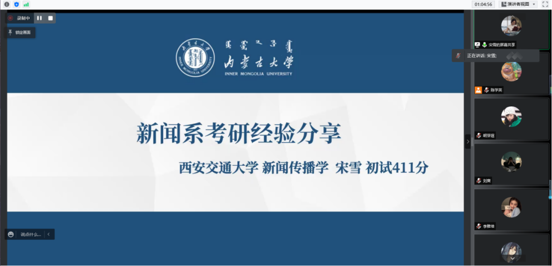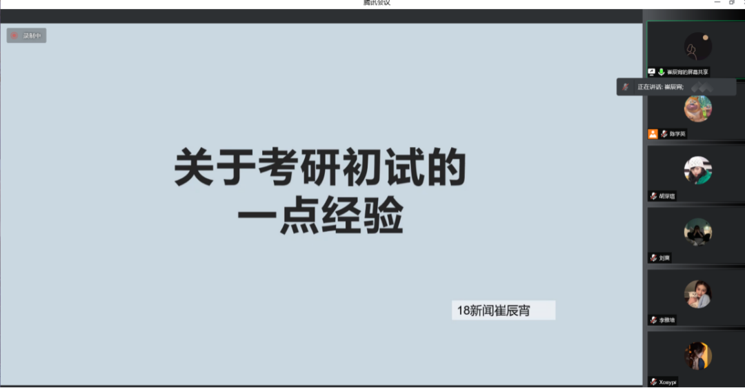 崔辰宵,2018级新闻学专业学生,考研至我校新闻与传播专业。他结合自己的经验,围绕考研初试准备阶段的择校、考试科目的复习等方面进行了细致的讲解,并为同学们介绍了新闻与传播学硕和专硕的区别。