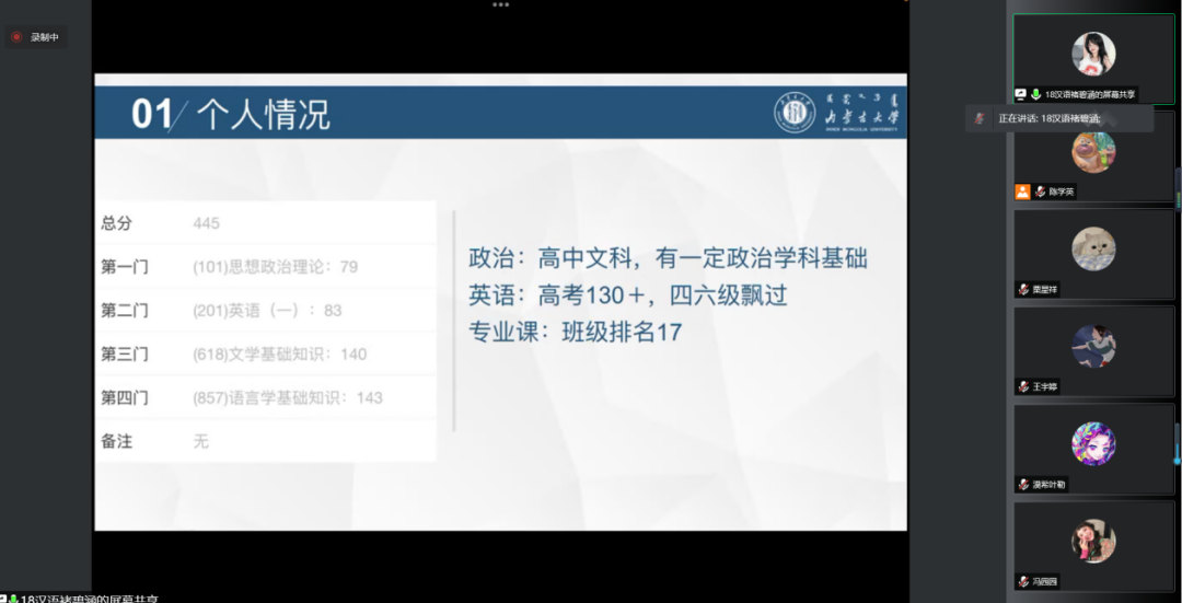 董美杉,2018级汉语国际教育专业学生,考研至南开大学语言学及应用语言学专业。她向大家介绍了研究生考试中大综合和小综合的区别,并提醒同学们要根据自己的兴趣、自身能力以及目标的实际情况来选择合适的院校。