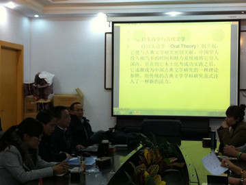 王枫老师首先向新入职的付建荣老师和云韬老师介绍了文新院青年教师学术沙龙的由来和发展,以及沙龙成立以来在科研和教学方面所起的带动作用。冯文开老师以《一个人的口头诗学视野》为题,讨论了口头诗学与古代文学、口头诗学与文学理论、口头诗学的研究方法三个方面的内容。在向大家说明口头诗学的概念、理论体系、研究方法之后,特别强调了口头诗学可以成为中国古典文学研究的理论参照,将会给中国古典文学研究范式注入新的活力。冯文开的主题发言引发各位青年教师的深入思考,张丽萍、赵乐、包薇、刘庆伟、王冲等几位老师就史诗的民族认同功能、“胡儿能唱”的《琵琶行》以及陕北地区两男一女形式的《李双双小传》表演唱是否属于口头诗学研究范畴、语言学与口头诗学的交叉研究等内容提问并由此展开热烈讨论。