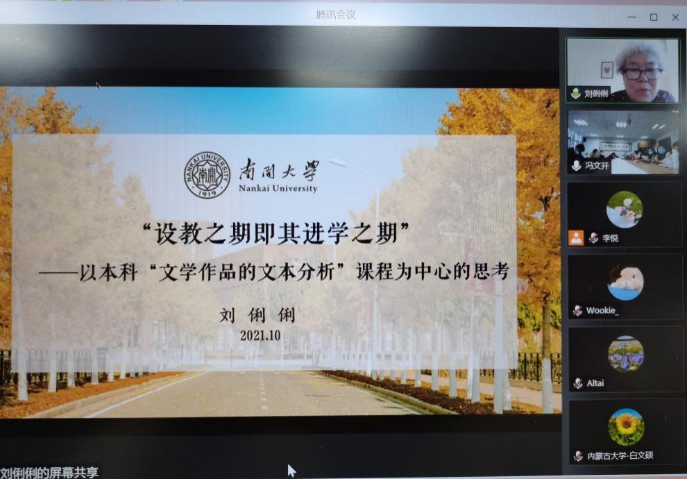 1026日下午3时,南开大学文学院刘俐俐教授通过“腾讯会议”在线上为我院师生带来一场题为《“设教之期即其进学之期”——以本科“文学作品的文本分析”课程为中心的思考》的精彩讲座。讲座由我院冯文开教授主持,我院刘志中副院长、云韬老师、白文硕老师等参加了讲座。