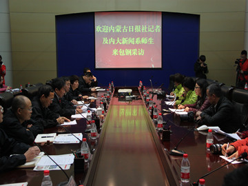 参观之后,经过短暂的午餐时间,内大师生一行与包钢各位领导人在座谈会上进行了深入的探讨,首先由包钢负责人李主任对包钢的收益情况,建设发展,管理模式,环保工作、发展目标等几个方面的公司概况做简要介绍,接着内大师生分为五个小组对包钢生产、技术、稀土、人事、环保五个方面的情况做了细致的采访,对于包钢发展有了进一步详细的了解。