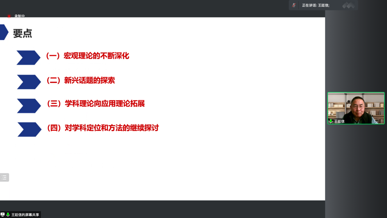 讲座伊始,王延信教授从“前沿问题”概念出发,详细阐释了四类前沿问题的由来,一是老问题常谈,常谈常新;二是老问题新谈,依据时代需求刷新老问题;三是基于新现象产生的新问题;四是基于艺术社会应用而生的新问题。他进一步指出前沿问题应具备关键性、时代性、应用性和创新性的特征,同时强调了前沿问题研究对艺术学理论学者的重要性。通过对艺术学理论学科过往研究成果的深入观察分析,王廷信教授建设性提出艺术学理论前沿问题研究方向的四个方面:一是宏观理论的不断深化,二是新兴话题的探索,三是学科理论向应用理论拓展,四是对学科定位和方法的继续探讨。在王延信教授看来,艺术学理论的学科魅力主要体现在它能不断引发研究者的探讨,学科活力则体现在各种前沿问题、应用话题的包容性思考。此外,艺术学理论作为一门方兴未艾的年轻学科,其发展有着充足的动力,时代的变迁、学科的交融以及国家政策的支持,都是这一学科不断发展的活力源泉。