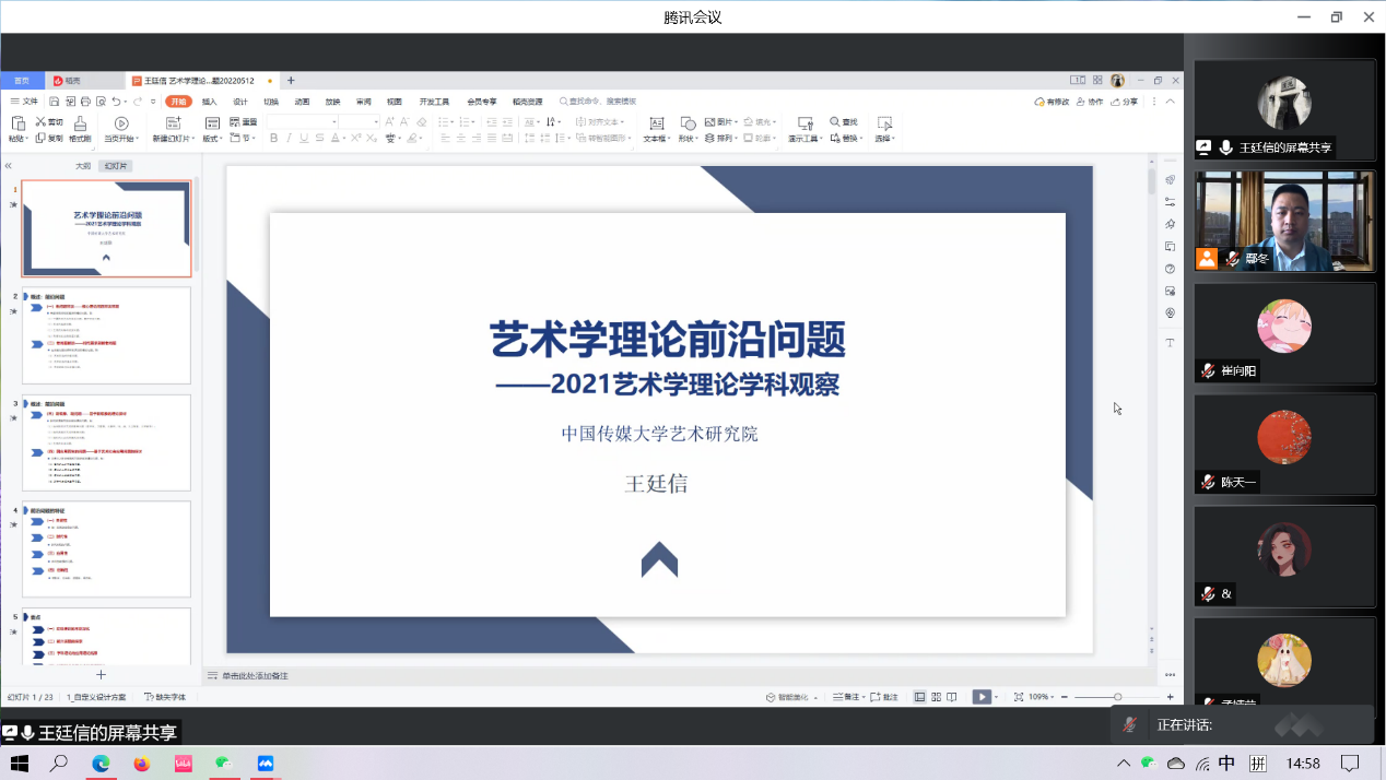 5月12日下午,我院成功举办第四期青年文艺论坛,本次论坛在线上举行,邀请中国传媒大学艺术研究院教授、博士生导师、常务副院长王廷信教授为广大师生带来题为“谈艺术学前沿问题”的专题讲座。讲座由艺术学理论硕士点负责人鄢冬副教授主持,学院副院长刘志中教授出席讲座,我院部分青年教师和相关专业研究生,内蒙古艺术学院部分教师和学生共同聆听本次讲座。