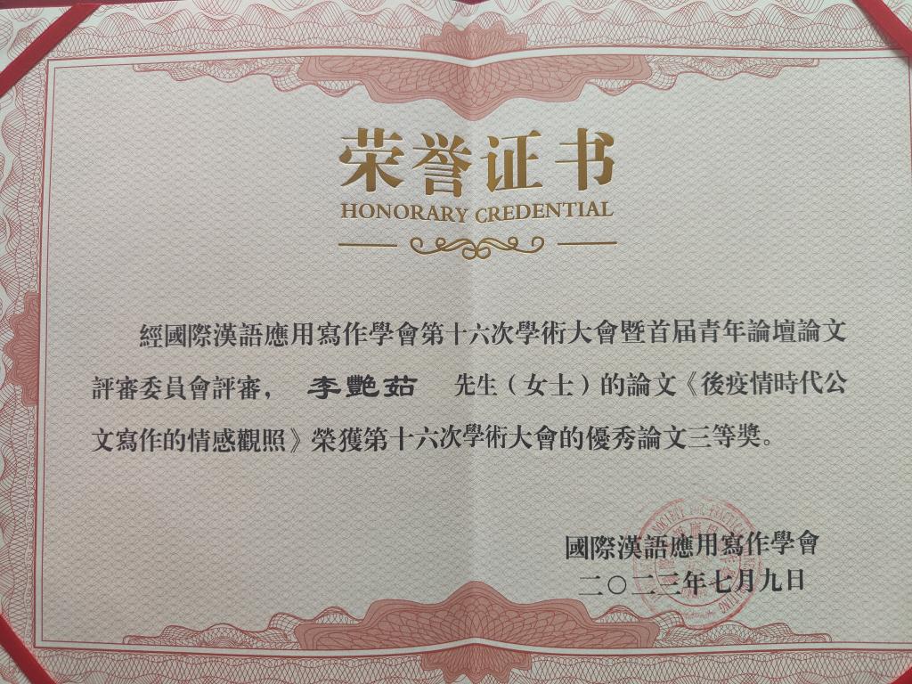 7月7日-10日,由国际汉语应用写作学会主办,信阳学院、香港理工大学中国语文教学中心联合承办的国际汉语应用写作学会第16次学术大会暨首届青年论坛在信阳举行。我院副教授、写作教研室主任李艳茹应邀参加大会,分别在大会发言和分组讨论中作了题为《后疫情时代公文写作的情感观照》的学术报告。本篇论文荣获大会优秀论文三等奖。