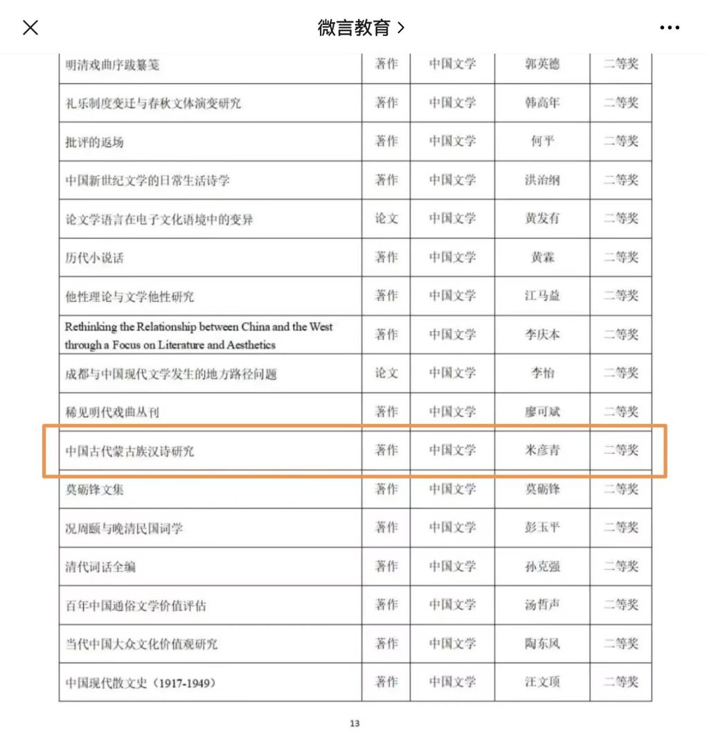 2月6日,教育部对第九届高等学校科学研究优秀成果奖(人文社会科学)评选成果进行公示,我院米彦青教授所著《中国古代蒙古族汉诗研究》荣获著作论文奖二等奖。