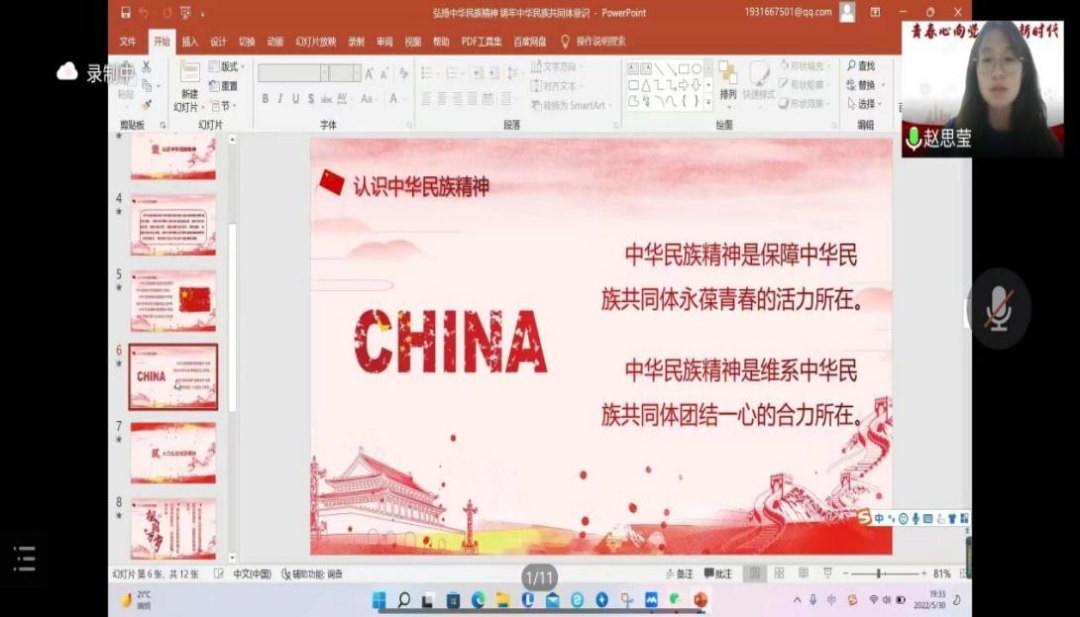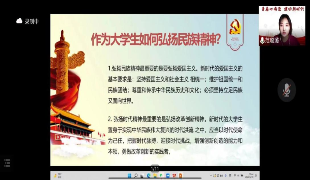 5月30日晚7:00,我院于腾讯会议平台组织青马班开展“弘扬中华民族精神,铸牢中华民族共同体意识”专题团课汇报展示,本次活动由我院团总支副书记任文秀老师和本科生辅导员邢佳玥老师主持,第十期青马班全体学员、2022年春季学期入团积极分子参加活动。学员们学理论、举实例、话心得,立足青年角度以小组为单位进行汇报展示。