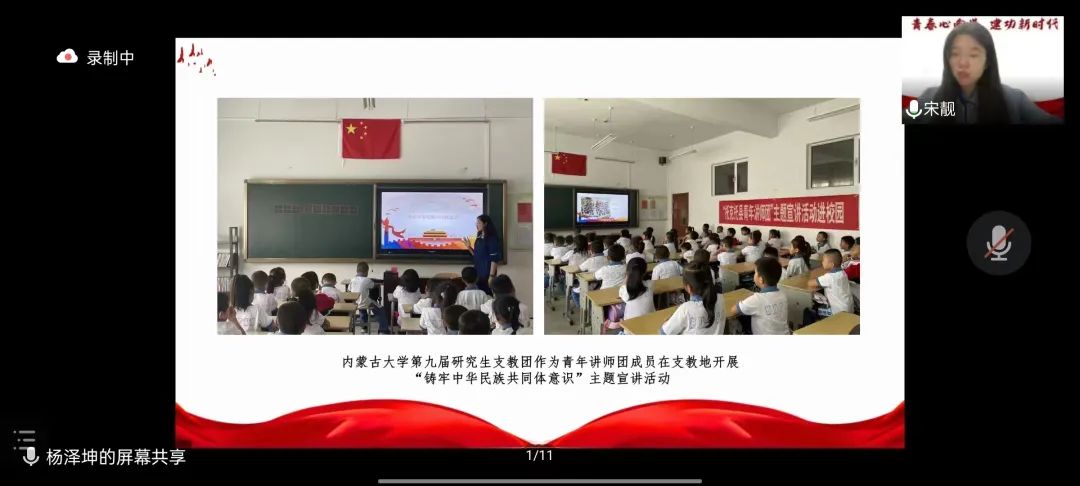 第一部分汇报人杨泽坤同学详细介绍铸牢中华民族共同体意识的由来及意义,并通过一个视频带领大家生动学习中央民族工作会议精神,聆听习近平总书记的谆谆教诲。最后分层次阐述了我国民族政策,强调铸牢中华民族共同体意识是国家统一之基、民族团结之本、精神力量之魂的重要意义;第二部分汇报人宋靓同学则结合个人本科时期所学的通识教育课、深入了解的学术研究、毕业后的支教经历三个方面与大家进行分享,并提出青年学生应深刻体会习近平总书记关于民族工作的重要论述,关心团结各民族同学,促进各民族像石榴籽一样紧紧抱在一起。