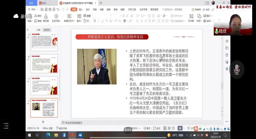 汇报人钱欣同学将汇报内容分为两个部分。第一部分围绕听党话、跟党走的主线,大致梳理出中华民族共同体发展历程;第二部分从厚植爱国主义意识、构筑民族精神家园的具体措施展开论述。她谈到:“经过千百年的凝聚,爱国主义被整个民族的社会心理所认同,在中华民族共同体中发挥出不可估量的作用。”随后,她分享了中国工程院院士、神舟飞船首任总设计师戚发轫同志爱国主义优秀事例,以此启迪同学们牢固树立中华民族共同体意识,将个人梦想与时代梦想相结合,并以此作为一生的志愿付出。