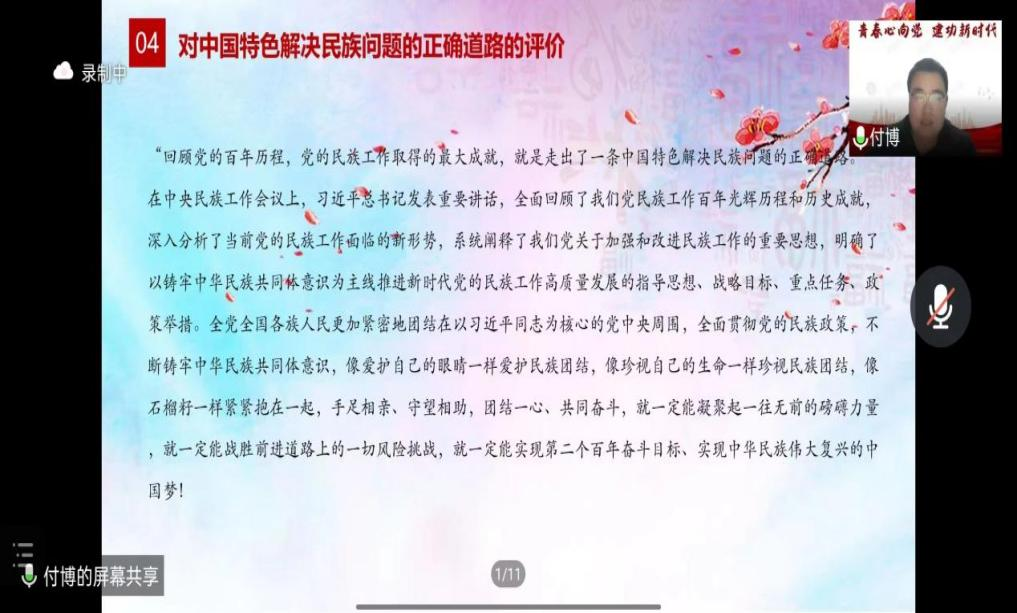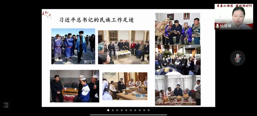 汇报人范璐璐同学带领大家回顾了自党的十八大以来,以习近平同志为核心的党中央就民族工作作出的一系列重大决策部署,为推动我国民族团结进步事业取得新的历史成就以及一些民族工作的经验。与此同时,她提到习近平总书记关于民族团结进步的重要论述:“我们讲中华民族多元一体格局,一体包含多元,多元组成一体,一体离不开多元,多元也离不开一体,一体是主线和方向,多元是要素和动力,两者辩证统一。”