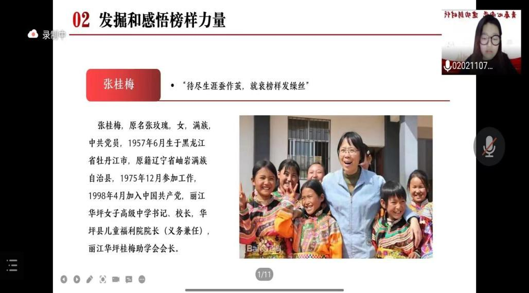 汇报人庞丙其同学围绕活动主题从三个方面进行总结:认识和弘扬民族精神、发掘和感悟榜样力量、铸牢中华民族共同体意识,并由民族精神的具体含义、重要作用和如何弘扬中华民族精神引出张桂梅、齐法宝、买买提江吾买尔三位榜样的事迹。“参天之木,必有其根,怀山之水,必有其源。”历史长河里,中华民族形成了伟大的民族精神,我们要从民族精神的意义内涵中把握时代脉搏,从光荣的民族模范中探寻使命和道路,汇集智慧,继往开来,砥砺前行。