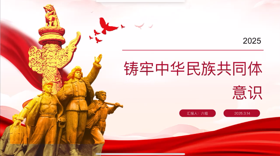 第六组同学通过为大家讲解中华民族共同体意识的定义与内涵、历史渊源与发展历程,突出强调了铸牢中华民族共同体意识的重要性,并指出我国正在面临的现实挑战以及应对策略。深入了解我国的历史与民族文化,增强对中华民族共同体意识的认同感,要树立正确的民族观与国家观,自觉维护国家统一与民族团结。