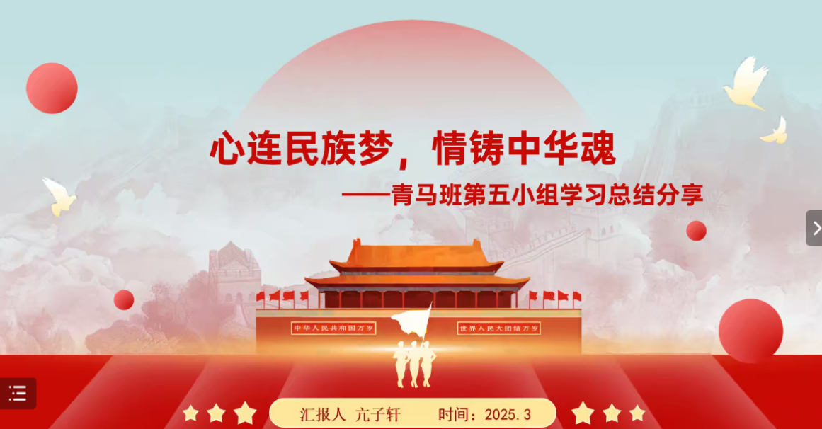 在这次线上第十二期青马班“铸牢中华民族共同体意识”学习总结分享会上,我们见证了青年学子们对铸牢中华民族共同体意识的深刻理解与坚定信念。铸牢中华民族共同体意识,是新时代青年义不容辞的责任与使命。让我们携手并进,在青春的赛道上奋力奔跑,将个人理想融入国家发展大局之中,以实际行动践行对伟大祖国的热爱与忠诚,共同书写中华民族伟大复兴的壮丽篇章!