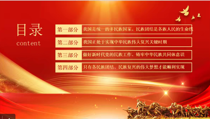 第三组同学的汇报,强调我国是统一的多民族国家,民族团结是各族人民的生命线;我国正处于实现中华民族伟大复兴的关键时期;做好新时代党的民族工作,铸牢中华民族共同体意识;只有各民族团结,民族复兴的伟大梦想才能顺利实现。