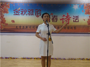 活动中,学院师生联袂为观众奉献了一场极具文化气息的艺术盛宴,他们赞颂祖国,歌颂秋天;他们歌咏青春,赞美校园;他们追寻理想,畅谈圆梦;他们吟诵经典,抒发情怀……古典的顿挫与悠扬,现代的激情与奔放,老师们的诠释,学生们的演绎,都令整场晚会高潮迭起。开场的集体诗朗诵《我骄傲我是中国人》,时而温婉挚真、时而激情澎湃,气势恢宏地拉开了比赛序幕,选手李燕云,以其清新婉转的原创小诗《遇见蒲公英的青春》带给观众如临其境的感觉;选手李梦竹带来的《相信未来》带给现场师生们生命的思索与积极向上的青春力量;选手高曼用真情实感诠释的《中国梦,龙图腾》大气磅礴,抑扬顿挫的节奏和对诗歌情感的准确把握,让现场观众与之共鸣共情;15号选手音韵组合朗诵的《中国的声音》生动展示了新闻人的职业理想和人生追求,感人的真实故事穿插在优美的诗句中,博得了现场观众阵阵喝彩。