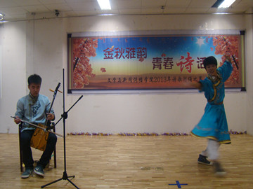 活动中,学院团总支书记、学工办主任张莉、青年教师黄肖嘉、马骐分别带来的《钗头凤》、《黄昏》、《你是人间四月天》的诗歌朗诵,将比赛推向高潮。马头琴伴舞和校园歌手徐付美智的独唱等精彩才艺节目,都为比赛锦上添花。
