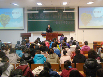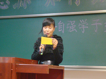 随后,为了激励同学们自强不息、奋发向上,在温暖和谐的氛围中,3名具有代表性的贫困优秀学生做了主题报告。2009级狄静静、2008级席磊、岳丽峰分别讲述了各自的生活学习经历和大学感悟。他们的经历不同,却有着共同的坚强与执着,他们克服贫困的障碍,感谢生命的磨难,收获丰厚大学,传递着励志青春的力量。狄静静讲的主题是“脚踏实地,磨练心智”,她来自山东农村,却有着创业的远大梦想,她以学习的毅力保持全班第一名的好成绩,荣获国家励志奖学金更是让她心怀感恩,她从树立信心、掌握学习方法等方面与大家分享了经验。岳丽峰的报告主题是“苦中作乐,天道酬勤”,他坦然面对家中的困苦遭遇并勇敢担当。“我们的明天必须靠我们自己的双手去奋斗,去争取。” 他的打工拼搏经历鼓舞和感动着同学们。席磊的报告主题是“勇于挑战,破茧成蝶”,他用幽默的语言,生动地讲述了自己从“网瘾少年”到“家庭顶梁柱”的曲折经历,家庭的巨大变故,大学同学的倾情相助,成长中的趣事、痛苦中的坚强、对同学的感激泪水、新浪网实习的快速成长,引起了同学们深深的思考。