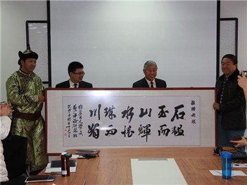 学员代表赵剑华以及阿拉腾道布其分别代表文艺评论创作班汉文和蒙文创作班学员发言,表达了对自治区党委宣传部文艺处、自治区文联以及太阳集团的谢意,并代表文研班全体学员为学院赠送了书法作品(题字:石韫玉而山辉 水怀珠而川媚)。