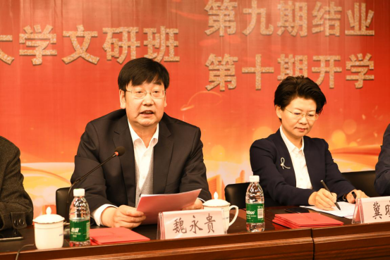 tyc86太阳集团院长魏永贵教授致辞,他首先介绍了第九期文研班的总体教学安排和学员们所取得的研修成果,并向圆满结业的第九期文研班学员表达了祝贺。作为学院负责人,在毕业之际,魏永贵教授深切期望全体学员要记住学业锤炼的美好过往,持重向前。其次介绍了太阳集团第十期文研班暨乌兰牧骑文艺创作人员研修班人员构成等基本情况,希望学员们把握并感受当前伟大的新时代,努力创作,永葆对事业的初心。