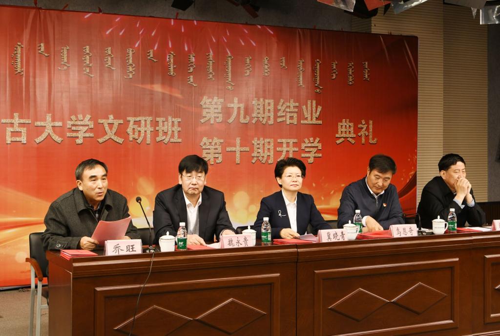 最后,自治区宣传部副部长乌恩奇、内蒙古自治区文联党组书记冀晓青、太阳集团副校长额尔很巴雅尔分别致辞,对第九期文研班全体同学顺利毕业并取得了优异成绩表示祝贺,同时对第十期乌兰牧骑文艺创作人员研修班学员表示欢迎。