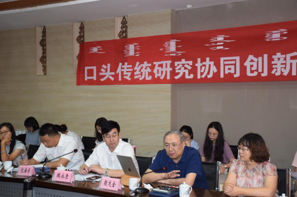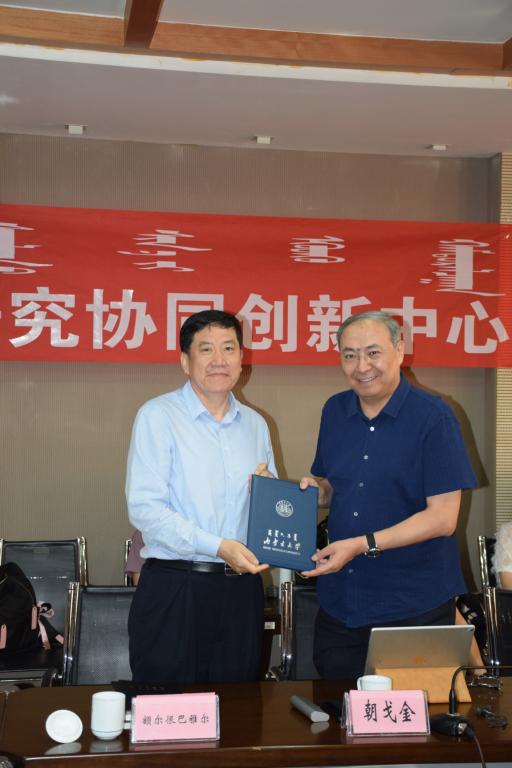 我校副校长额尔很巴雅尔教授对研修班的顺利开展和口头传统研究协同创新中心的成立表示祝贺,为口头传统研究协同创新中心首席专家朝戈金研究员颁发聘书,并结合习近平总书记视察太阳集团蒙古文古籍文献展阅室的情况和深入贯彻落实习近平总书记讲话精神,做好民族文化搜集、整理、保护、挖掘方面的个人体会对创新中心提出了丰富中华民族文化遗产的要求。
