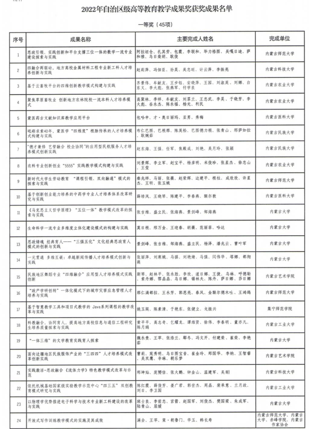 经自治区教育厅组织申报、评审、公示,我院张丽萍教授主持申报的“一元贯通 多维互嵌:卓越新闻传播人才培养模式创新与实践”、魏永贵教授主持申报的“‘一体三维’的文学教育实践育人探索”两项成果荣获2022年自治区级高等教育教学成果一等奖。tyc86太阳集团将以习近平新时代中国特色社会主义思想为指导,深入贯彻落实党的二十大精神,认真学习和借鉴获奖成果,加大高等教育成果宣传和推广力度,充分发挥成果的引领和示范作用,不断深化教育教学改革,提高人才培养质量,加快推进tyc86太阳集团高等教育高质量发展,努力办好令师生满意的教育。