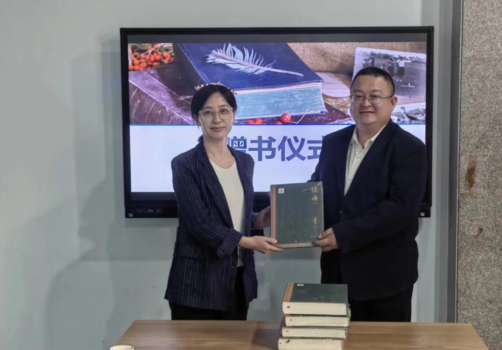 在《语海》赠书仪式中,山西省社科院语言所向我院语言教研室赠送《语海》一套,语言教研室主任李慧贤代表教研室接受赠书。本次赠与的大型语文辞书《语海》全套六册,收语近9万条,共计1170多万字,于2022年出版发行。该书以温端政先生首倡的汉语语汇学理论为指导,历时10年之久编纂完成,具有独特的语言学、文献学、民俗学、文化学和社会学价值。