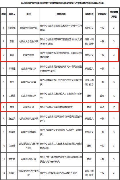 9月18日,2023年度内蒙古自治区哲学社会科学规划项目新时代文艺评论专项拟立项项目名单进行公示,我院李旺老师获批重点项目(资助10万),韩琛老师获批一般项目(资助3万)。