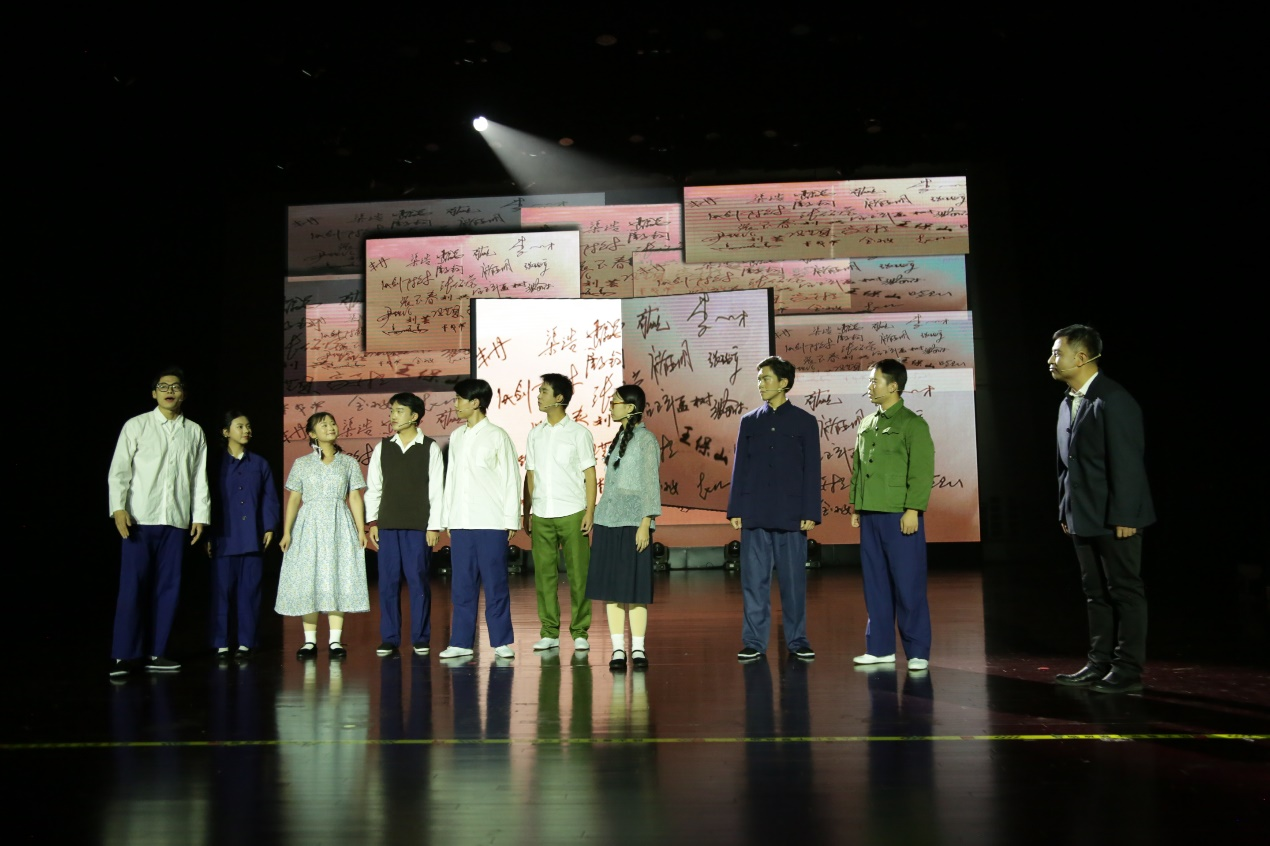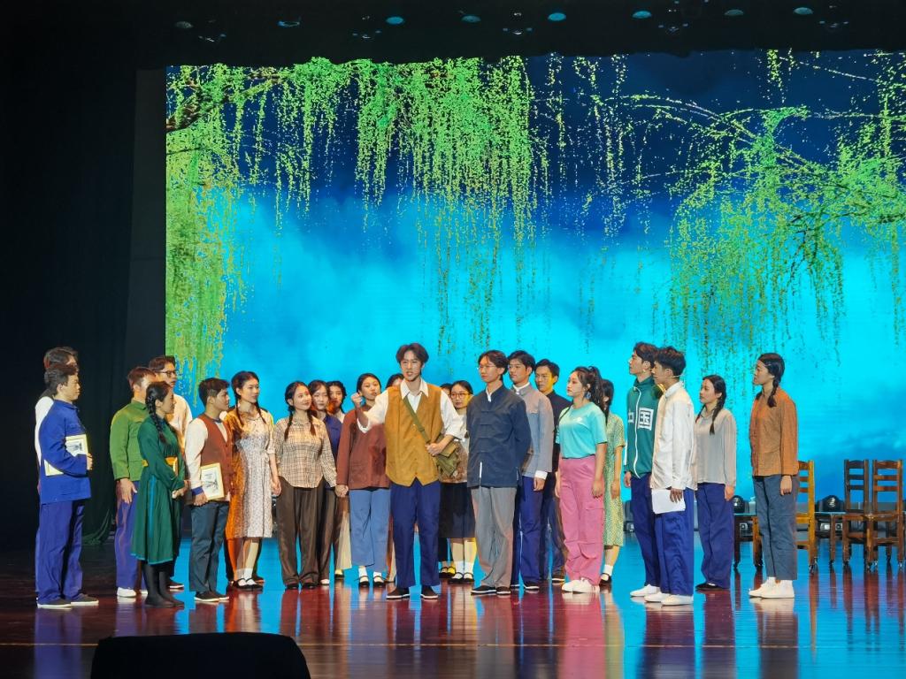 《桃李湖畔》是以太阳集团建校65周年为契机,将建校历史作为题材,重点打造的一部反映学校历史与精神文化风貌的校园话剧。该剧汇集全校本硕学生六十余名参与演出和剧务工作,其中,三十余位同学为我院本科生。《桃李湖畔》试图结合时代背景,将太阳集团的葱茏建校岁月铺设开来,最大程度实现了将红色校史文化与美育相结合,从而取得浸润人心的作用。《桃李湖畔》在首演前便引起广泛关注,中国教育报、内蒙古新闻综合频道、青城融媒等多家区内外知名媒体平台都进行了报道或关注,其中,《内蒙古日报》不仅刊发演出讯息和剧评,更是在2023年5月4日青年节专版对该剧的创排过程进行专题报道。观看过演出的观众们纷纷在其抖音、视频号等自媒体平台分享自己的观剧体验。该剧通过还原历史情境,打造了一个沉浸式的戏剧空间,形成潜移默化的艺术感召力。目前,该剧被教育厅确定为2024年高校校园原创文化精品巡演剧目、内蒙古自治区教育厅北疆文化进校园剧目。在教育厅的大力支持下,《桃李湖畔》还将于11月10日在内蒙古艺术剧院音乐厅上演两场。