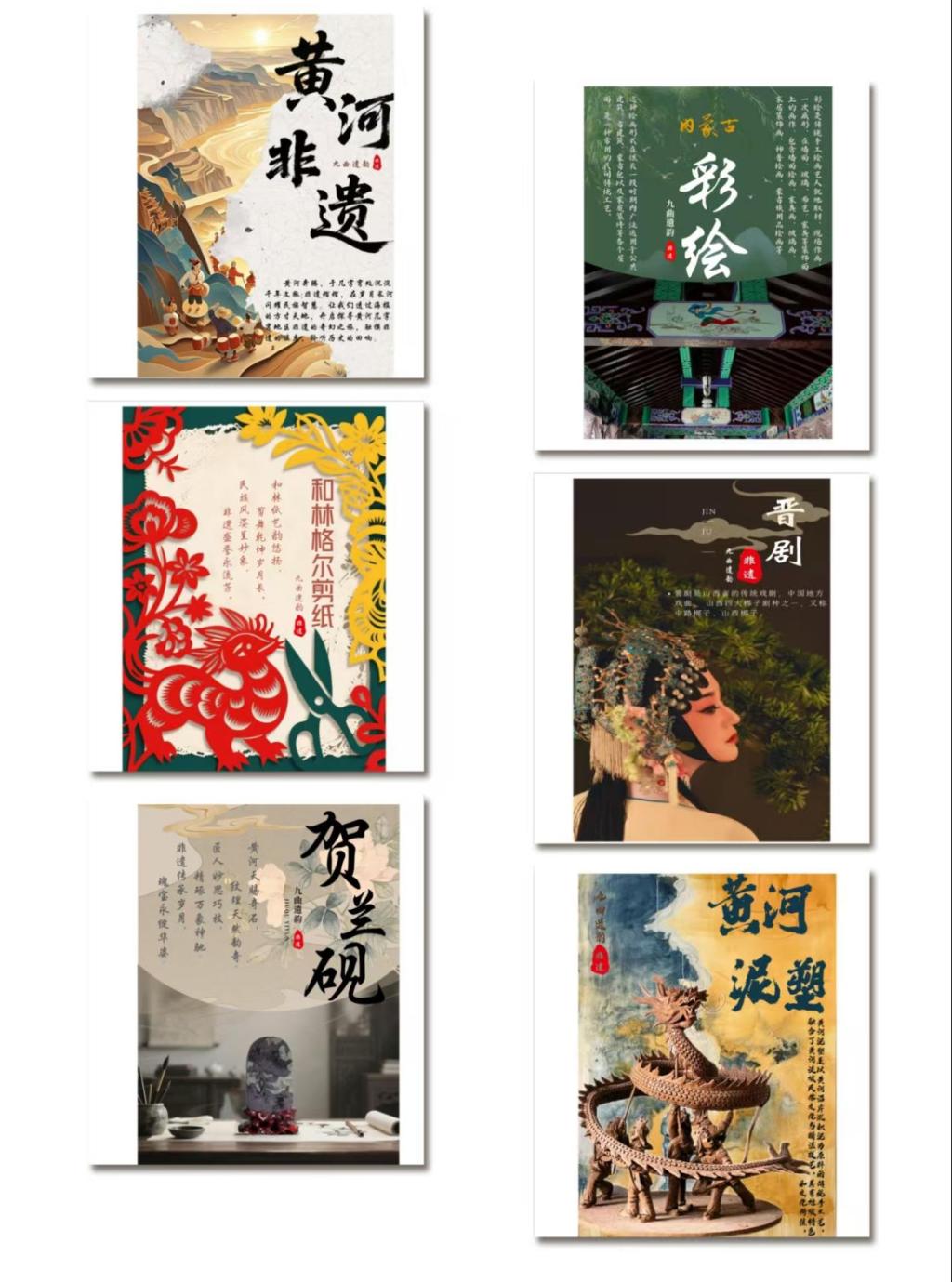活动现场,色彩斑斓、创意十足的海报整齐排列,生动展现了黄河几字弯地区丰富多样的非物质文化遗产。每张海报都巧妙融合传统非遗元素与现代设计理念,将剪纸、刺绣、石雕等非遗项目以新颖的视觉艺术形式呈现,通过精心的色彩搭配和独特的构图布局,为传统非遗赋予了新的表现力,引得众多师生驻足观赏、拍照打卡。