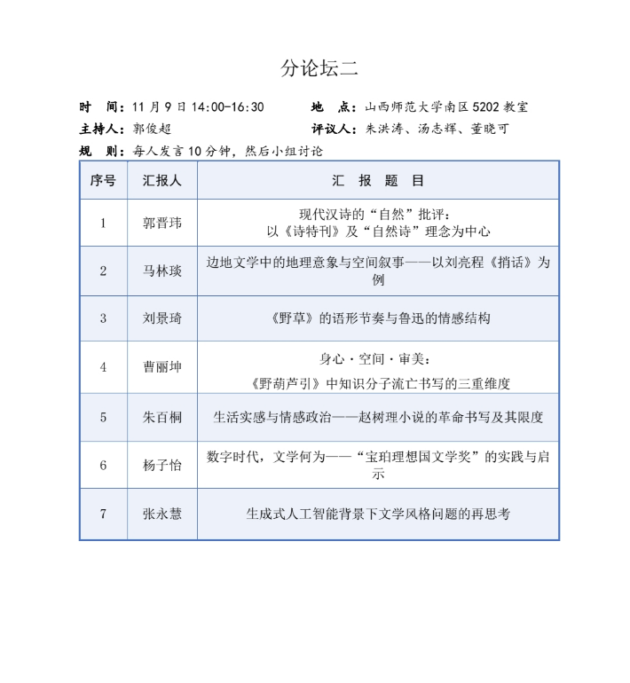 11月9日,我院学生刘景琦应邀前往山西师范大学,参加由山西师范大学文学院、研究生院举办的第七届研究生硕博论坛暨首届“求是”青年论坛。这也是刘景琦同学第二次入选山西师范大学文学院的硕博论坛。此论坛为全国高校学子提供了高质量的学术交流平台,促进了跨校、跨领域的学术对话。