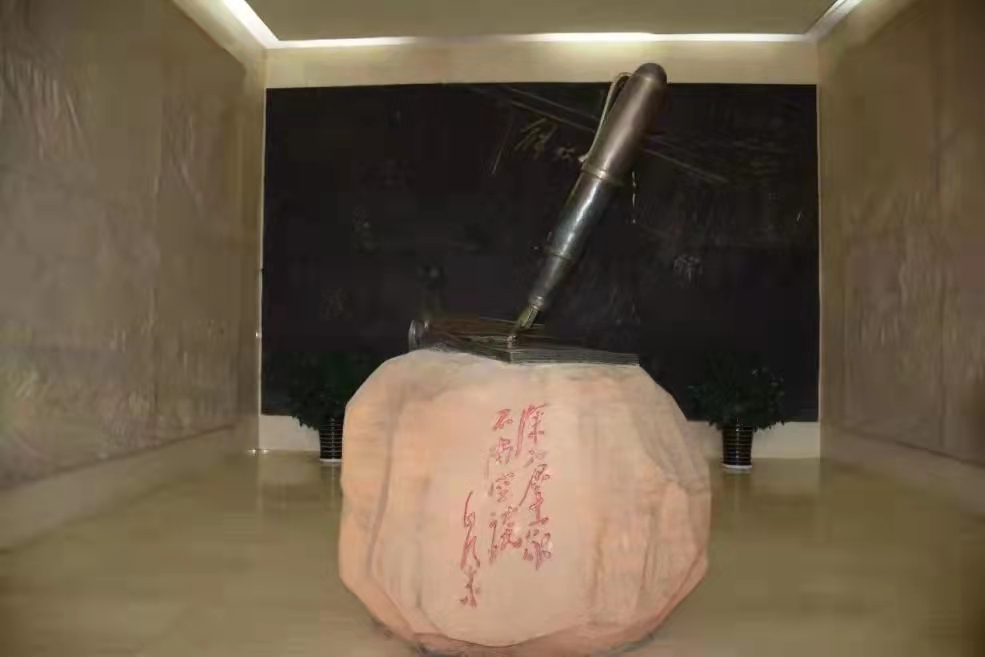 步入延安新闻纪念馆大厅,毛泽东同志题写的 “深入群众,不尚空谈” 赫然映入眼帘,简单的八个大字凝聚着“贴近实际、贴近群众、贴近生活”的新闻宣传精神。石刻上面的钢笔赫然屹立,象征着中国共产党人以笔为枪、起而行之的斗争精神。