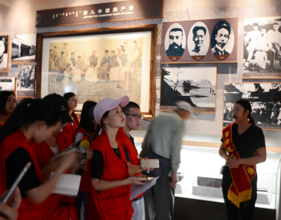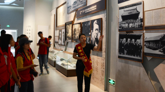 学生正在认真听讲解员讲解有关乌兰夫同志加入中国共产党和百灵庙抗日武装暴动的历史