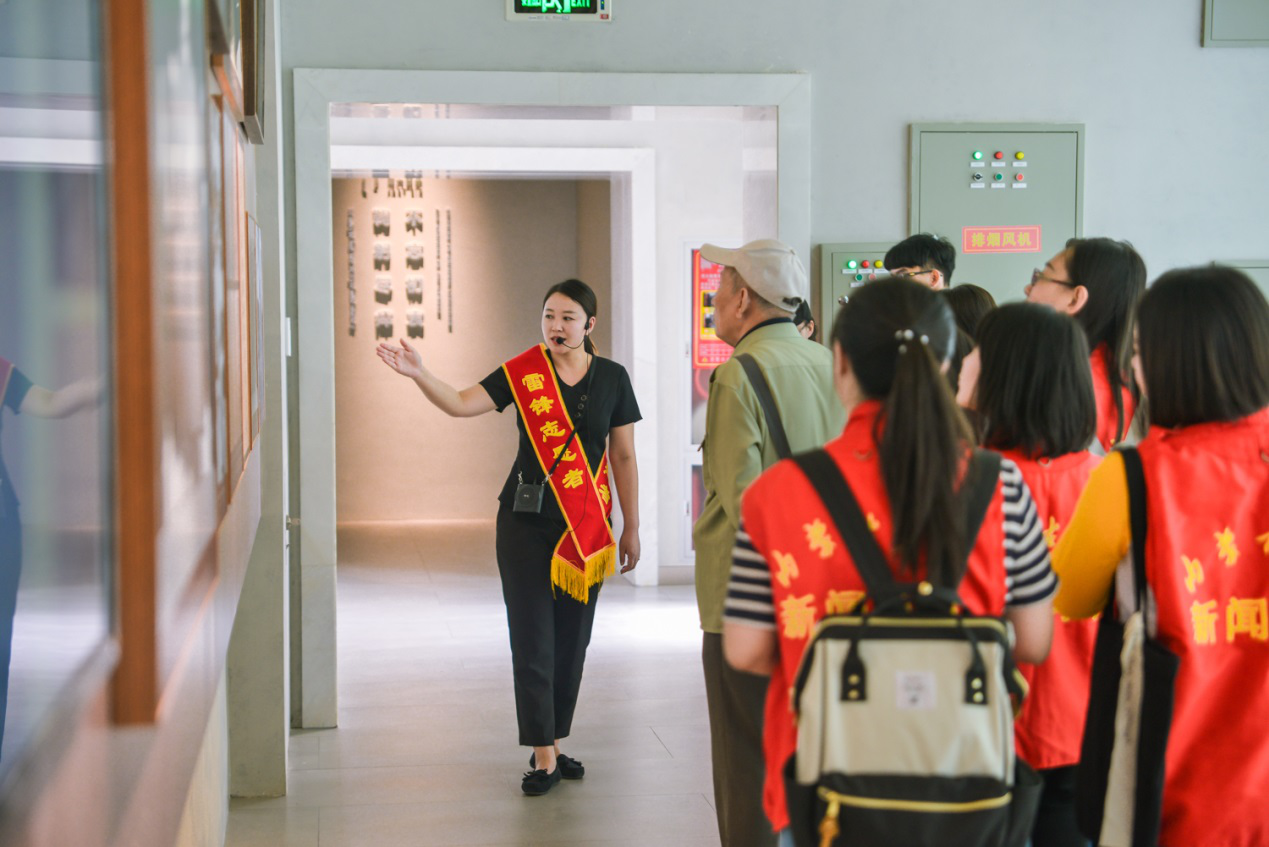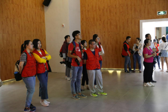 太阳集团新闻系主任刘寒娥教授正认真听讲解员讲解