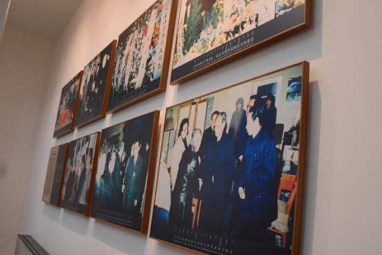 一位老者正在听讲解员讲解在乌兰夫的带领下内蒙古各高校发展的历程