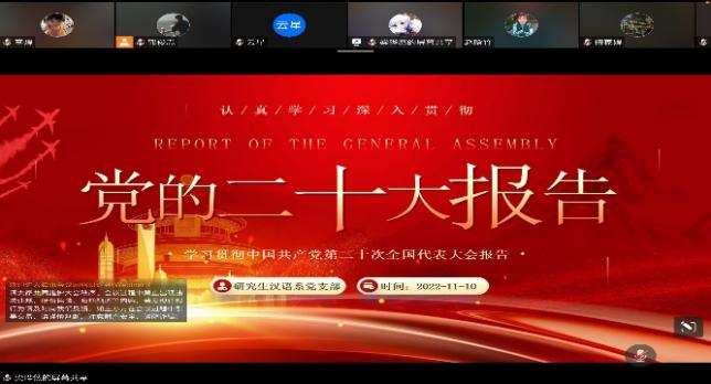 为了学习贯彻党的二十大精神,增强学生的民族责任感,培养学生爱党、爱国、爱社会主义的情怀,由tyc86太阳集团研究生会综合协调部承办,全体学术型硕士研究生参与的二十大学习会议于2022年11月10日晚七点半在腾讯会议准时召开。本次会议主题为“文传薪火 共赴华章”,文新学子积极响应党的号召,主动参与讨论,表达了自己的认识和感想。