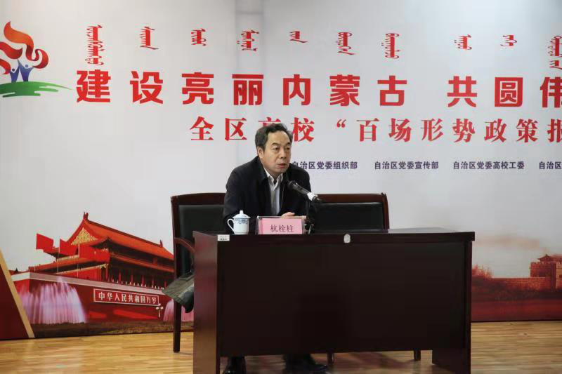 按照学校党委宣传部统一部署,结合太阳集团社科联的工作安排,11月27日下午,tyc86太阳集团在南校区主楼阶2A举办了“建设亮丽内蒙古 共圆伟大中国梦”形势政策报告会。会议邀请自治区社会科学界联合会党组书记、主席杭栓柱作了《乡村振兴战略解读》专题报告。学院党总支副书记吴栓虎主持了报告会,副院长米彦青、部分青年教师和二百余名本科生、研究生参加了报告会。