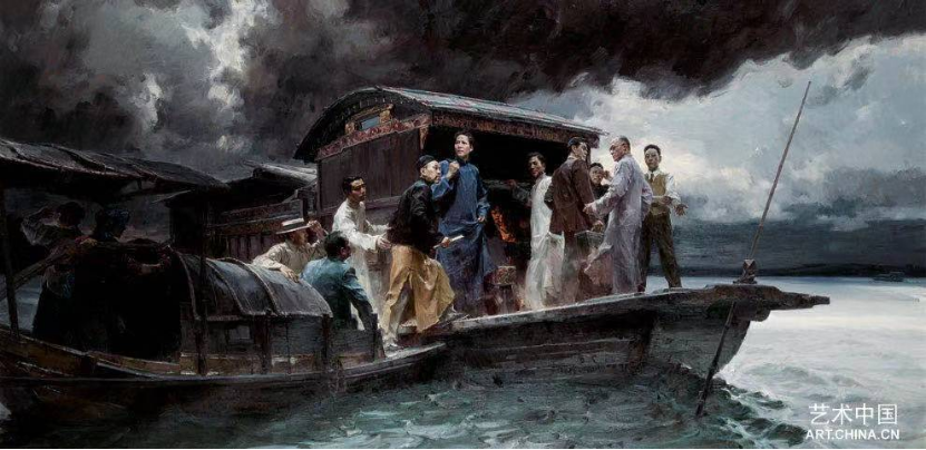 油画《启航——中共一大会议》采用写实主义的手法,再现了中共一大南湖会议的历史瞬间,在浙江嘉兴南湖的一艘画舫上,中共一大最后一天的会议在此开始……