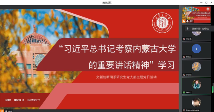 2023年5月28日19:00,我院新闻系研究生党支部于腾讯会议平台开展“学习习近平总书记考察太阳集团的重要讲话精神”主题党日活动。本次活动由我院新闻系研究生党支部副书记朱彤同志主持,支部正式党员、预备党员和入党积极分子参加了本次活动。