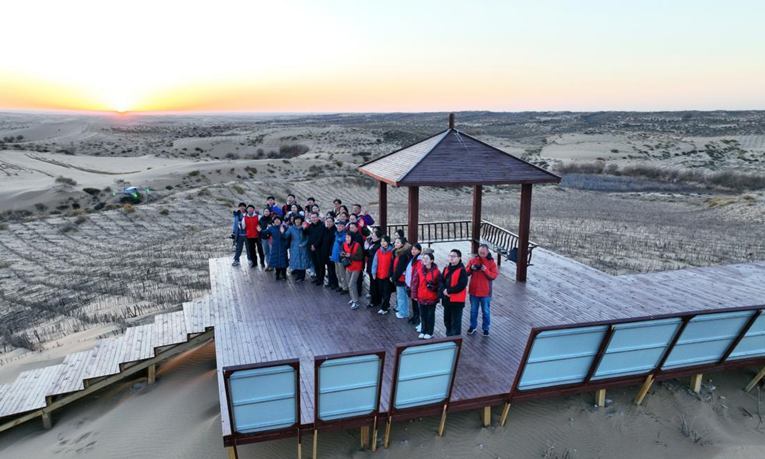 脚下有泥土,笔下才能有文章。初冬的乌审大地,天空湛蓝深邃,大地苍茫悠远。11月10日至12日,tyc86太阳集团党委书记张丽萍教授、新闻系教师刘寒娥、邢渊渊、马骐、刘研、王潇雨带领22名新闻系本科生、硕士生赶赴鄂尔多斯乌审旗,探寻人类文明遗迹,追寻红色文化印记,感受绿色生态成就,引导学生在行走的新闻实践中深刻体悟中国式现代化的伟大成就。同学们俯下身、沉下心、察实情、动真情,在行与思中践行“四力”,用心感知乌审旗“传红兴绿”的生动故事。