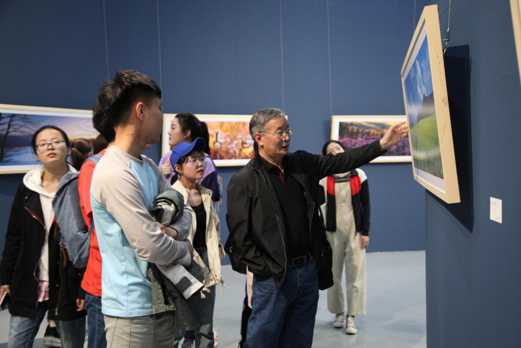 授课开始,万生云老师带领同学们来到美术馆四楼,参观达斡尔族摄影家郭伟忠先生题为亮丽内蒙古,净土呼伦贝尔的师生摄影作品展。在授课过程万生云老师多次提到构图和光线对作品的重要性摄影作品同类图形相同的排列或者不同图形错落排列,均要保证画面整体性的完整统一,不能破坏画面的均衡。摄影画面中形象大小,比例适中,满足视觉悦目的需求,保持形象之间的协调,于变化中求单纯,于变化中求愉悦,于秀美中求和缓。 同学们从中收获颇丰。
